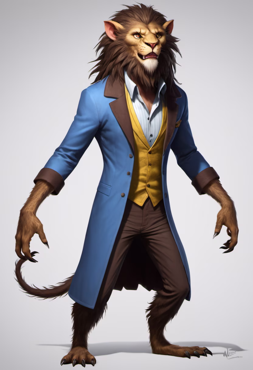Prompt: muscular werelion roaring, furry were-creature, full body character art, concept art