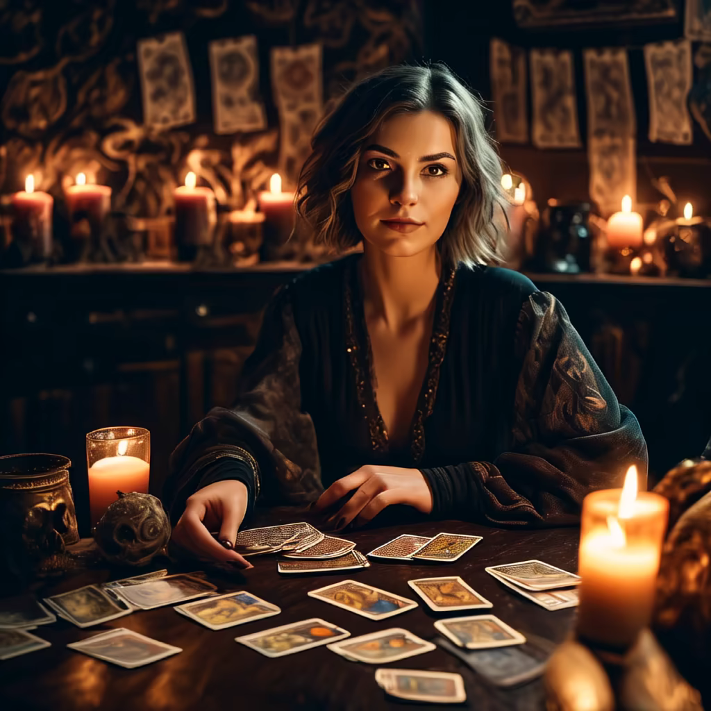 Prompt: An image depicting a person sitting at a table with a Tarot spread, and various symbols related to potentially unpleasant or taboo topics such as death, sex, and violence laid out on the table in front of them