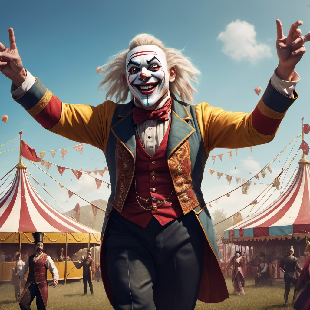 Prompt: A fantasy image of a circus fairground in a field with people having fun. Floating above the fairground is the jovial smiling face of the ringleader. He looks a little like Ghengis Khan and Immortan Joe.