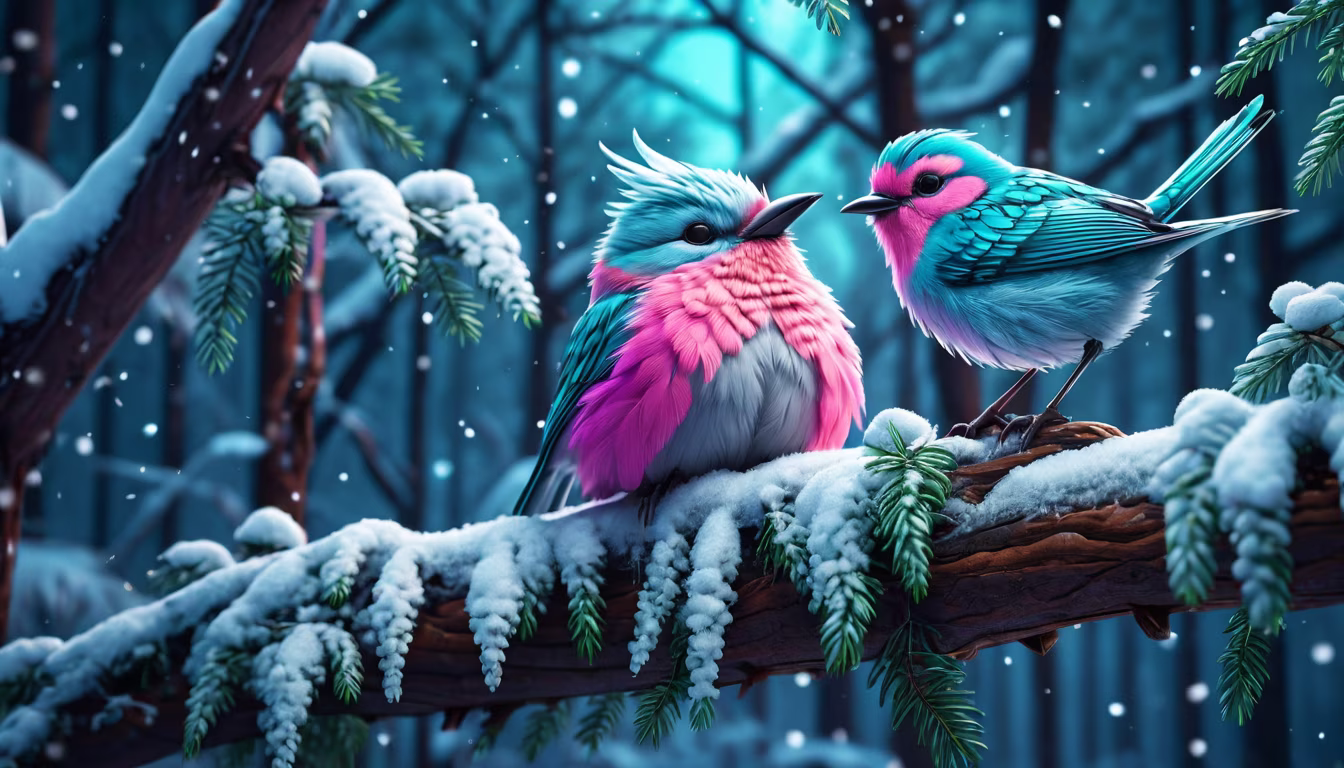 Prompt: Winter forest, snowflakes falling, little bird lying on a branch, eyes closed, mouth open