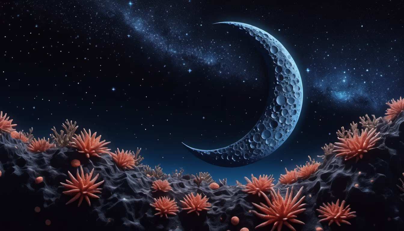 Prompt: blue atmosphere night sky celestial art with moon, stars, planets visible, hd 3d 32k amazing bioluminescent waves clear ocean with coral reef fish sharks, overly beautiful surreal serene scene with angels, spirits sprites orbs
