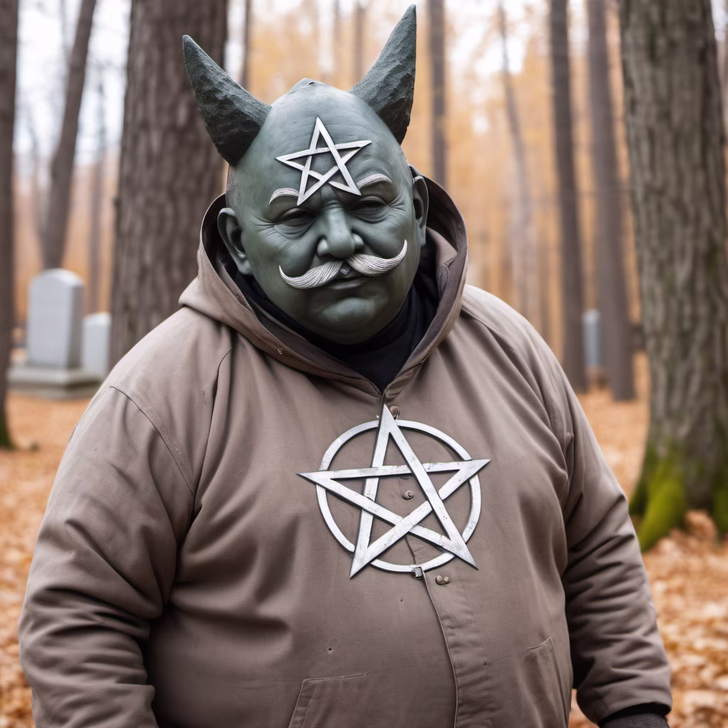 Prompt: a scary fat man in a mask with a satanic pentagram drawn on an autumn day in a cemetery and crows flying in the sky