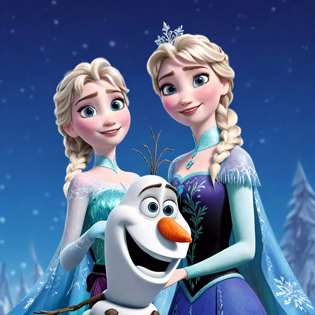 Prompt: Create a 3D Disney Frozen princess, with long dark wavy hair, mixed-race brown eyes, thin eyebrows, slightly large forehead, round cheeks, slightly square faces, round nose with a thin tip, delicate mouth