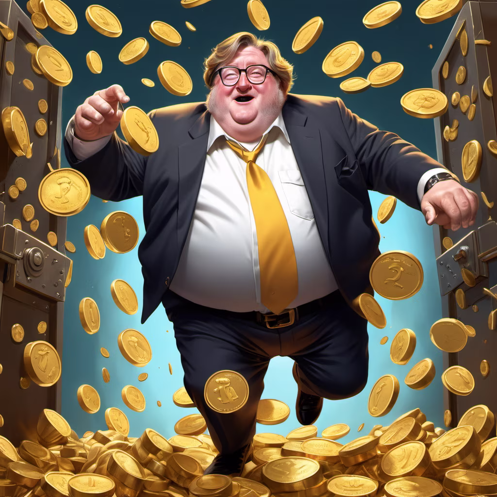 Prompt: gabe newell diving into a bankvault full of gold coins, in the style of Carl barks
