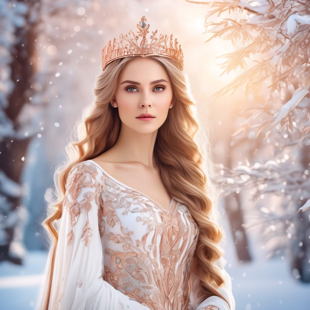 Prompt: create a Russian woman wearing a white dress made from fragments of elegant white crystal colors rose gold, woman with cape, long hair, loose hair, medieval hair, braids in hair, medieval, braids,full hair, voluminous hair, perfect, hair rose gold rose, very beautiful, anthropomorphic photography, beauty of a woman, beautiful woman, with long flowing hair, long hair, perfect woman, impeccable makeup, beautiful woman, with crystal tiara, magnificent winter background, winter magic in background, background brightness, ultra resolution, ultra image, hd, Premium image