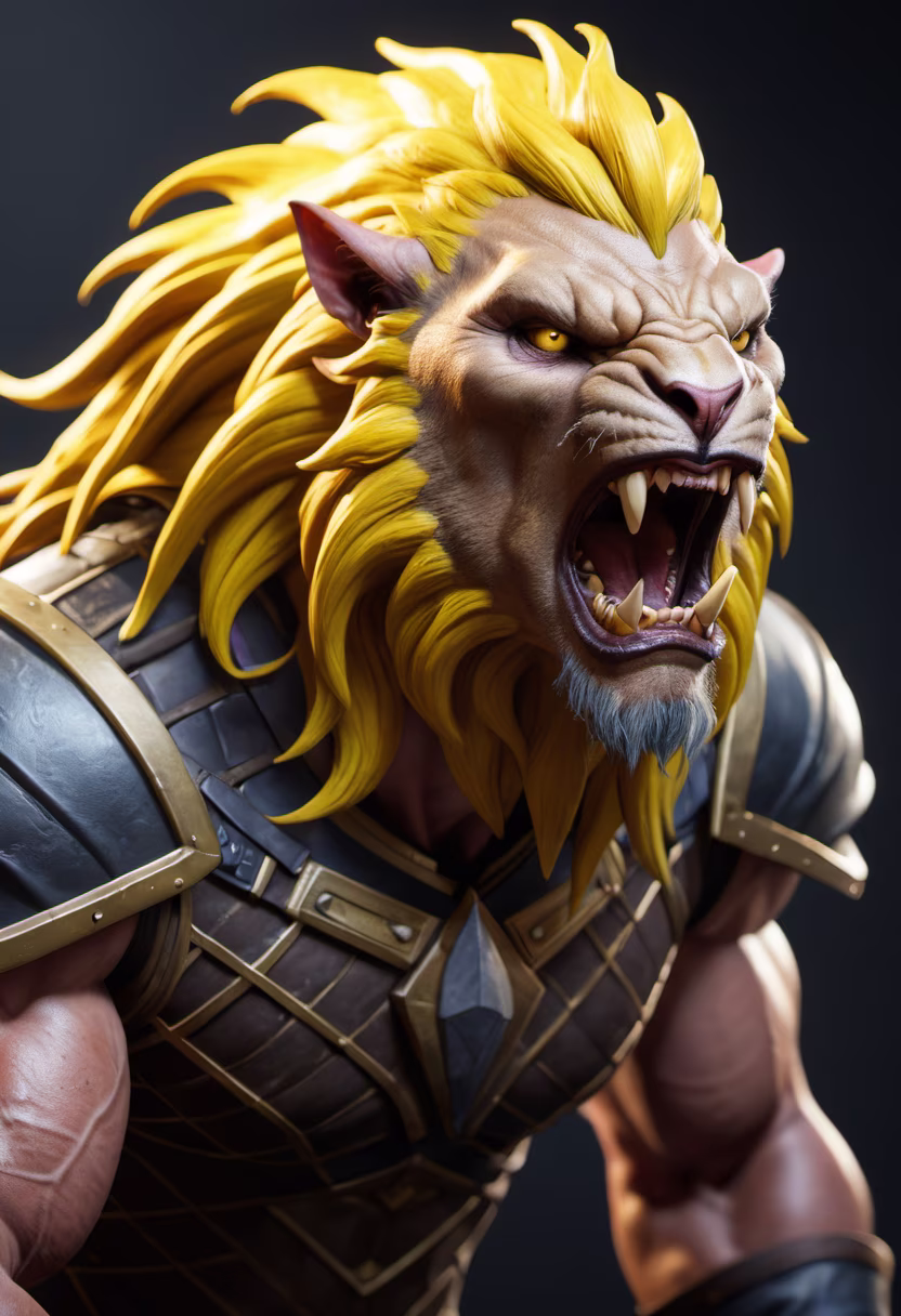 Prompt: werelion roaring, muscular were-creature with a yellow mane