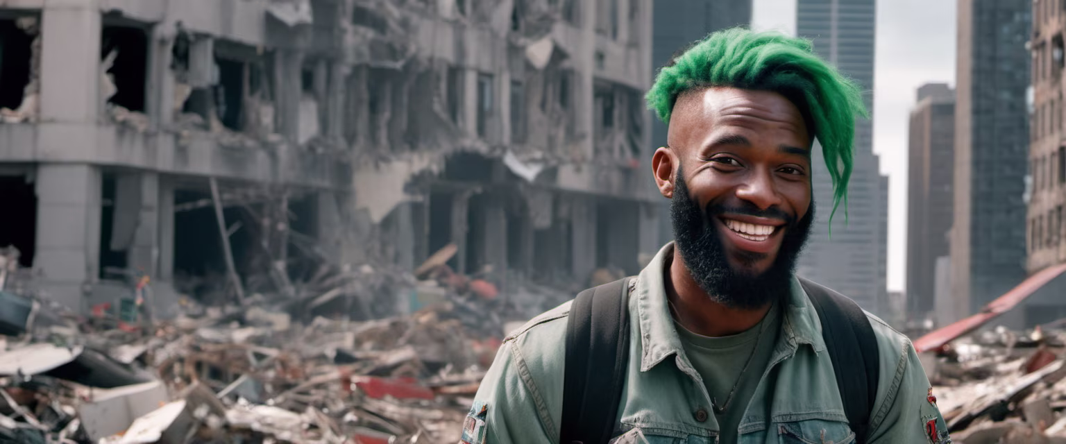 Prompt: smiling black man in shabby clothes in patches, with long green hair on his head and a bright red beard in the middle of a destroyed city with skyscrapers