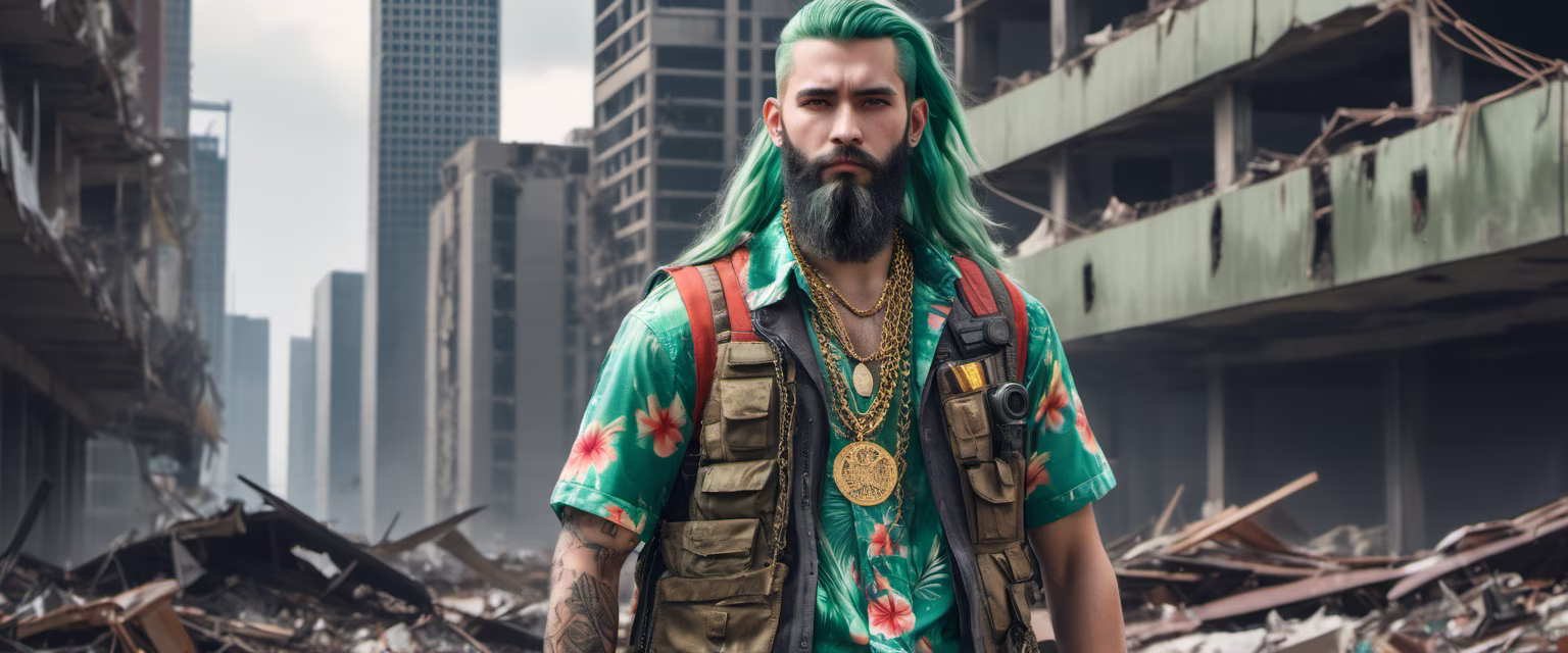 Prompt: a young black man with green hair and a long beard, hung with dozens of gold chains, dressed in a shabby bright Hawaiian shirt and on top of it a military bulletproof vest with patches. a man stands in the middle of a destroyed city with skyscrapers, holding an AR-10 in his hands