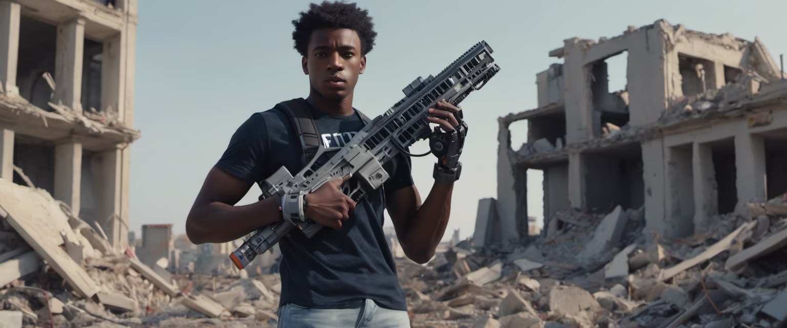 Prompt: a young black man with a naked torso and with robotic prostheses of both legs stands in the middle of the ruins of the city and holds an ar-10 in his hands