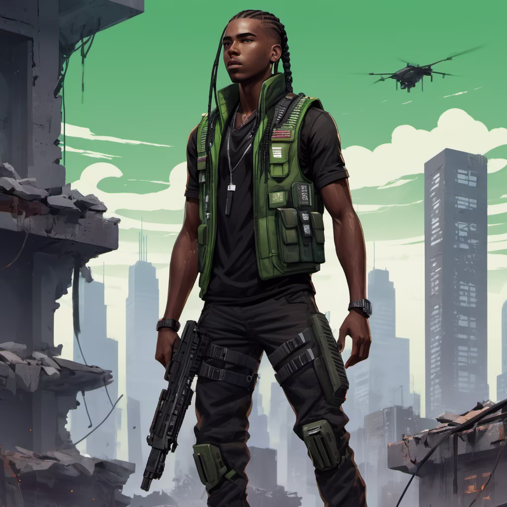Prompt: a sullen young black guy with green hair and a long beard hung with gold chains, dressed in shabby black clothes with patches, in the middle of a destroyed city with skyscrapers holding an AR-10 in his hands