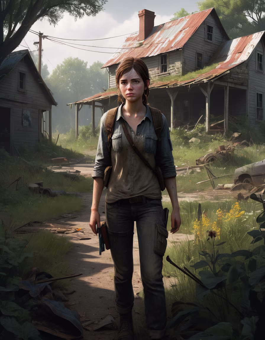 Prompt: A cinematic concept art rendering of Ellie from The Last of Us Part II, scavenging through an overgrown backyard of a crumbling farmhouse, loose realistic oil painting style, by Jakub Rozalski and Alan Lee, lush vibrant wildflowers and weeds reclaiming the landscape, backlit in a dramatic Rembrandt lighting scheme, misty morning sunlight creates atmospheric golden godrays, sparse detailing emphasizes the post-apocalyptic mood, 15K masterpiece quality, artstation trending