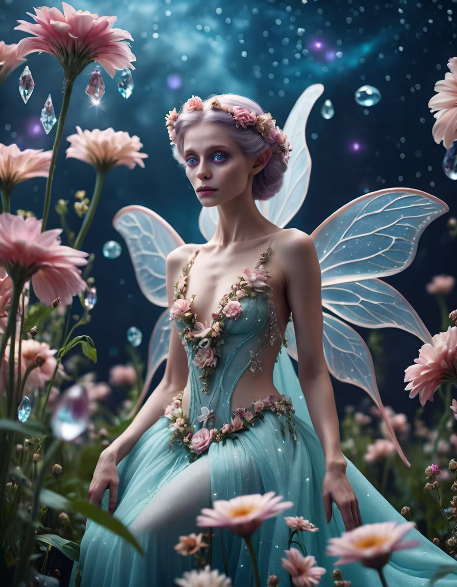 Prompt: A quirky hyper-realistic portrait of an alien fairy woman, pastel, flowers, crystals, lightly ethereal, wispy aesthetic, 8K studio photograph, inspired by Vladimir Kush, Annie Leibovitz, Gregory Crewdson, Vivian Maier, Sally Mann, Cindy Sherman, Edward Burtynsky, Richard Avedon, Lauren Greenfield, concept art, photo realism, highly detailed subjects, purposeful compositions, exquisite details, natural lighting, emotive moods, psychological insight, visually compelling, masterful technique.
