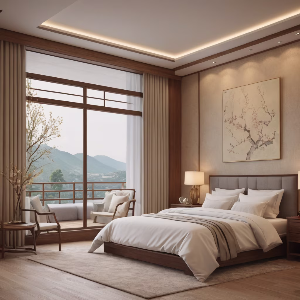 Prompt: Fresh and warm feeling of China, interior bedroom decoration, detail enhancement, rich composition, realism, 16K