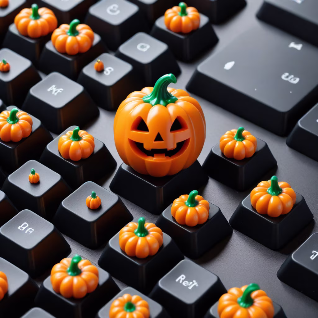 Prompt: Craft a whimsical 3D-rendered artisan keycap for mechanical keyboards with a delightful pumpkin theme. Infuse meticulous detail into the charming pumpkin elements, ensuring a unique blend of artistic allure and ergonomic functionality. The glossy resin cover adds durability and a polished finish to the design, creating a visually captivating addition to any keyboard setup.