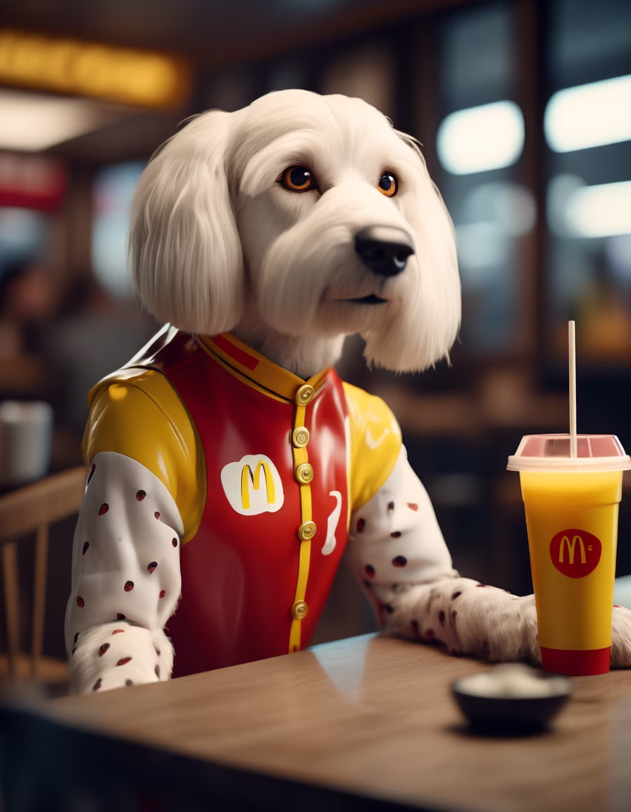 Prompt: render,a humanoid dog working in retro mcdonald's, hyper realistic (DOF) ,surreal