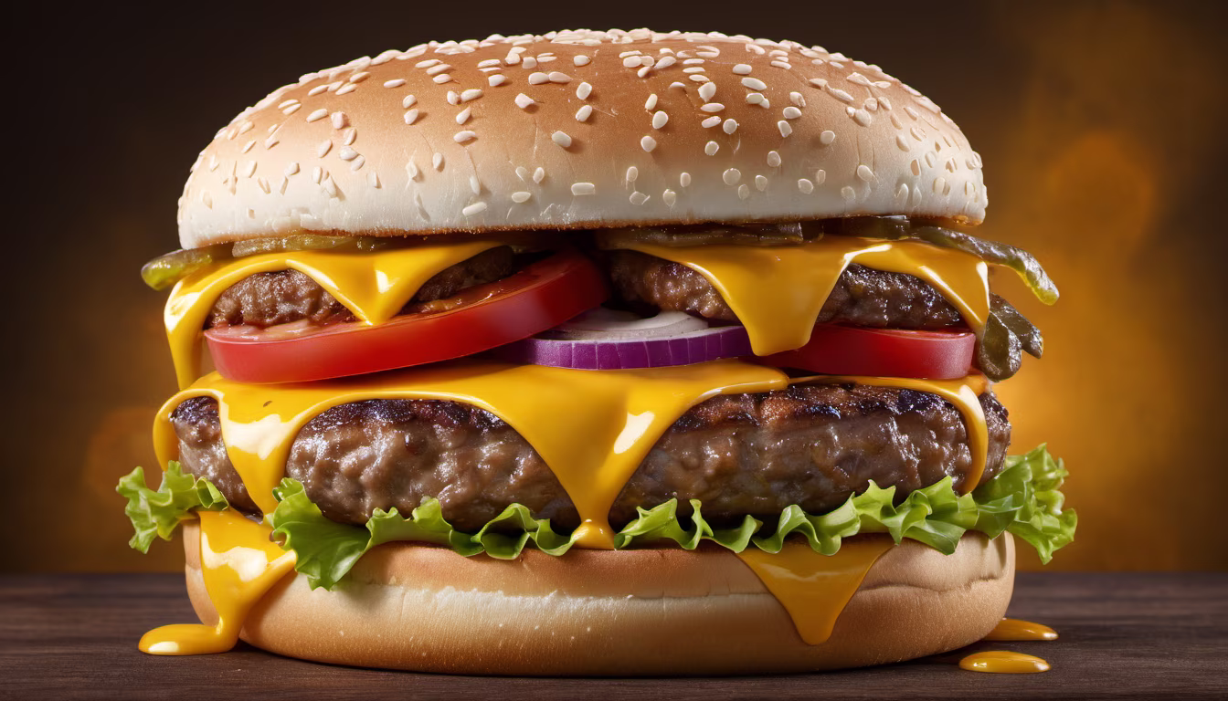 Prompt: McDonald’s Cheeseburger amazing Delicious food photography::4Well-lit, sharp-focus, high-quality, artistic, unique, award-winning photograph, Canon EOS 5D Mark IV DSLR, f/8 aperture, 1/125 second shutter speed, ISO 100, professional lighting setup Adobe Photoshop, appetizing composition, attention to detail::3