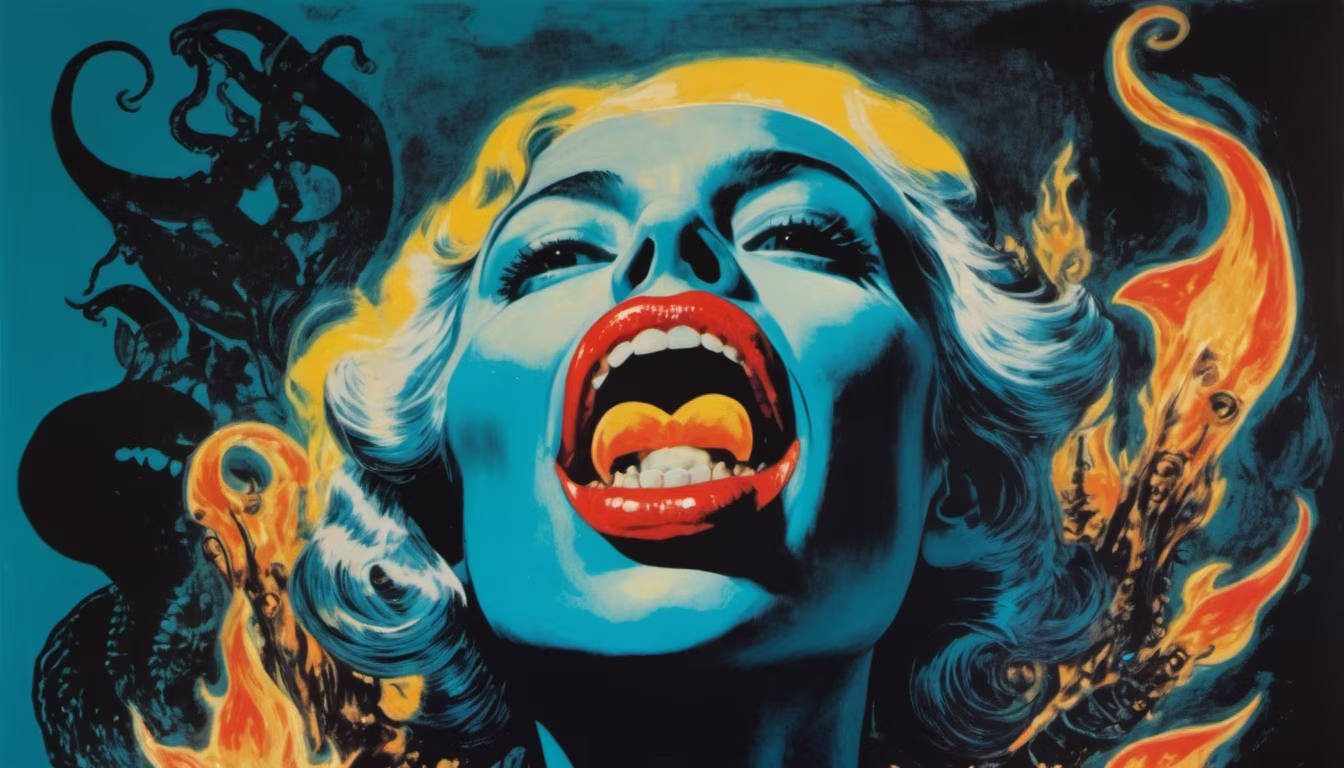 Prompt: Andy Warhol painting of a female humanoid which look likes something between the deep ones of Lovecraft and mermaid, with very extreme big lips, she using aquatic magic at an medieval festival, flames, crowd surfing.