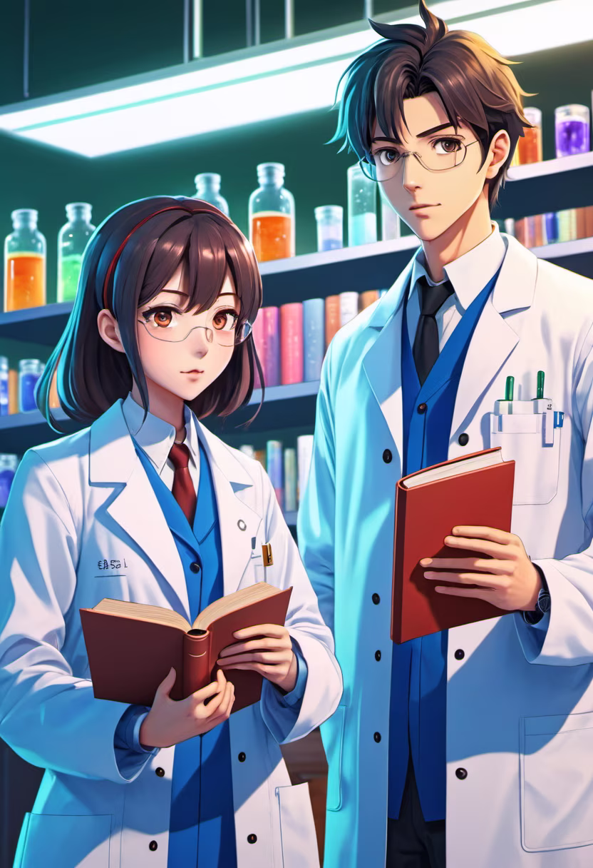 Prompt: In the laboratory, two R\u0026D personnel are in the laboratory, wearing white coats. One is a 20-year-old woman with eyes and a test tube in her hand. A 25-year-old man is holding a book in his hand, (3D cartoon), wide angle
