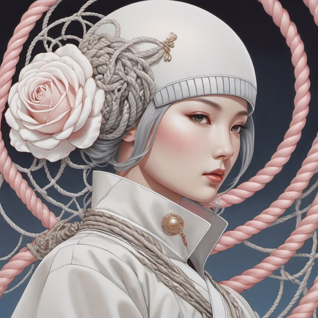 Prompt: Abstract, rose, ((eggshell, human curves)), rope, twisted lines,l,exaggerated style, ukiyo-e influence, by Miho Hirano,Kay Nielsen,Ryohei Hase,