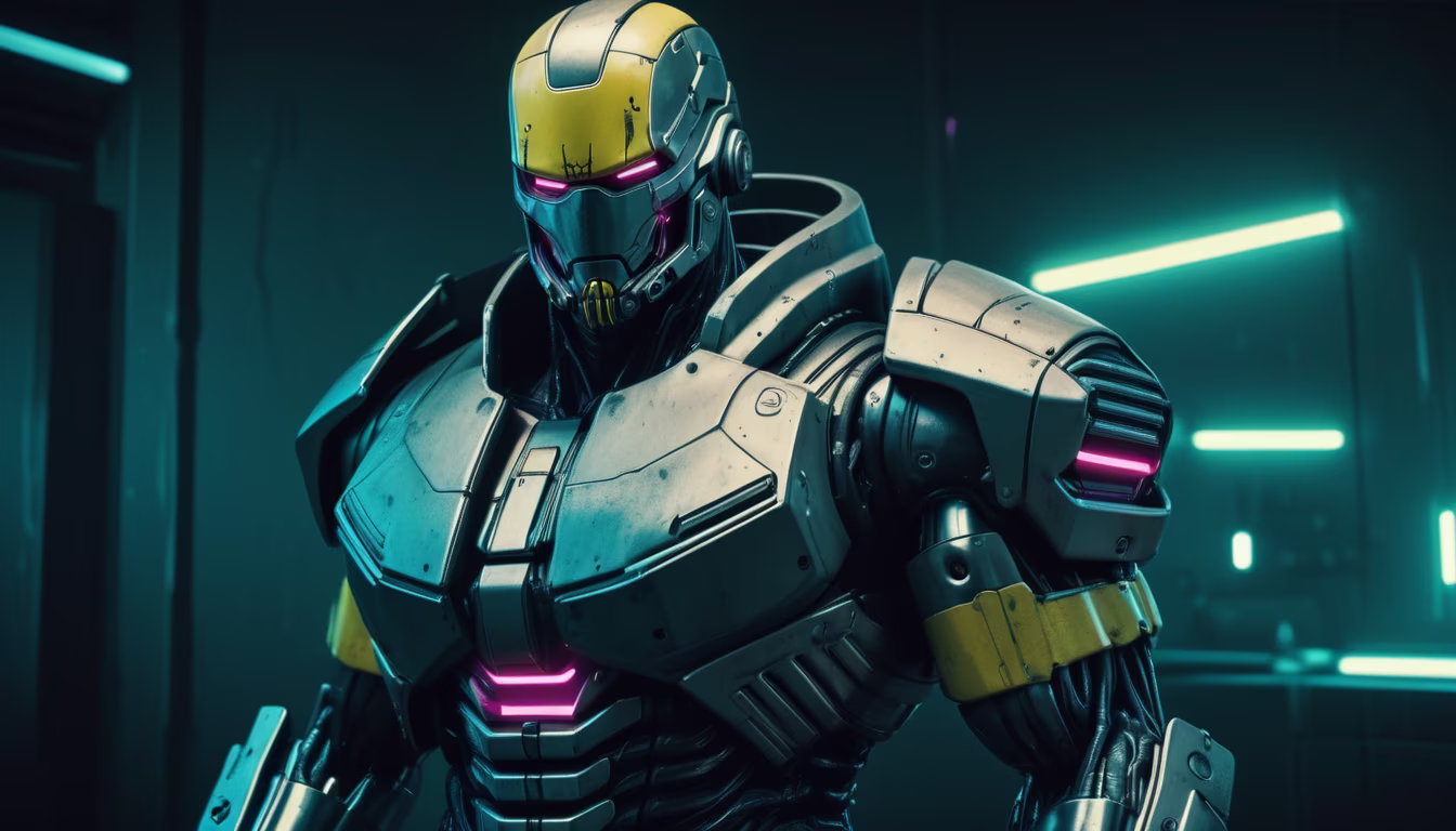 Prompt: character design, Cyberpunk 2077, Huge size, heavily armored, erocious, Medium Long Shot(MLS), hyper quality