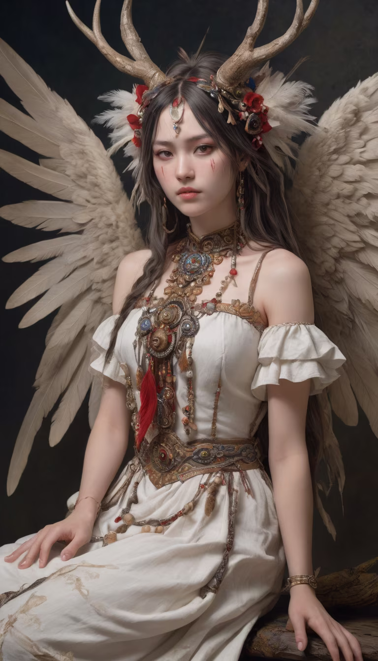 Prompt: painting of a woman with a goat's head and a dress, dark surreal art, butterfly, flesh and bones, portrait in the style of craola, small horns, aesthetic, pale sky, unknown artist, author unknown, dark and moody aesthetic, on pinterest, white horns, ceremonial, blood witch