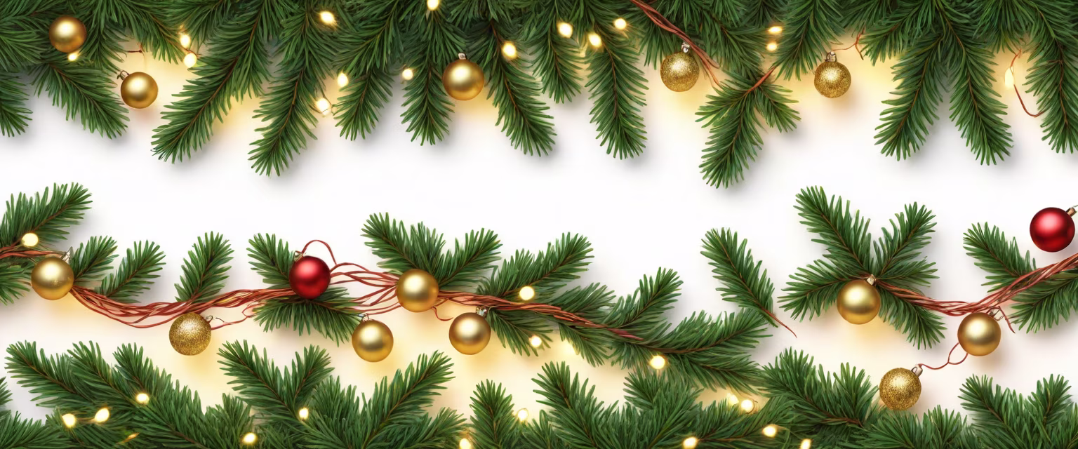 Prompt: Seamless christmas decorative on top border with coniferous branches and garlands of christmas lights on white background, 16k ultra high resolution, very sharp, ultra high detailed, high saturated image