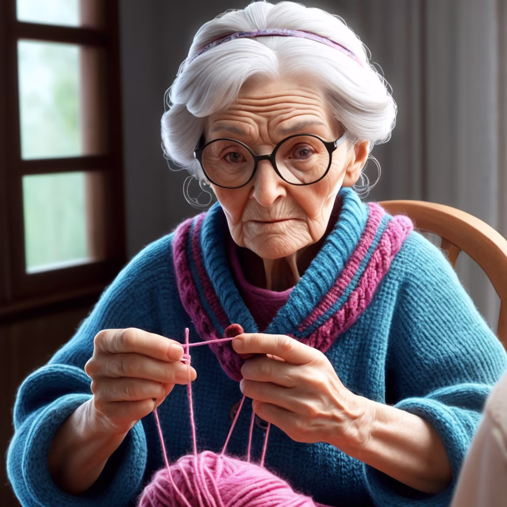 Prompt: A warm home, with sunlight shining inside, and an old lady sitting on the sofa happily knitting a sweater