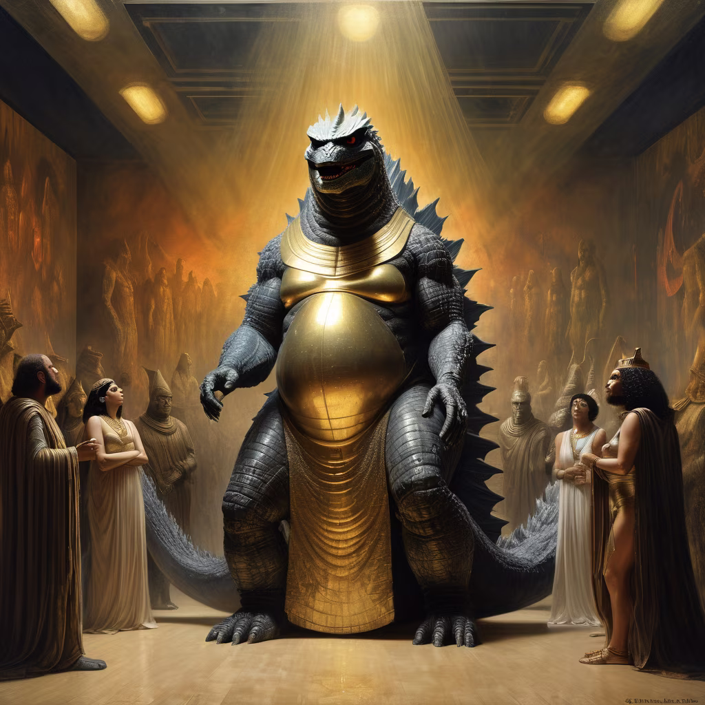 Prompt: Godzilla as a disco pharaoh, king tut, disco ball, studio 54, ancient Egypt, by odd Nerdrum, Beksinski, Alyssa monks, Michael Whelan, Norman Rockwell, worthington whittredge, Davinci, Michelangelo, Gerald brom, Diterlizzi, sharp focus, 8k, best quality, a masterpiece, dark and gritty, surrealism