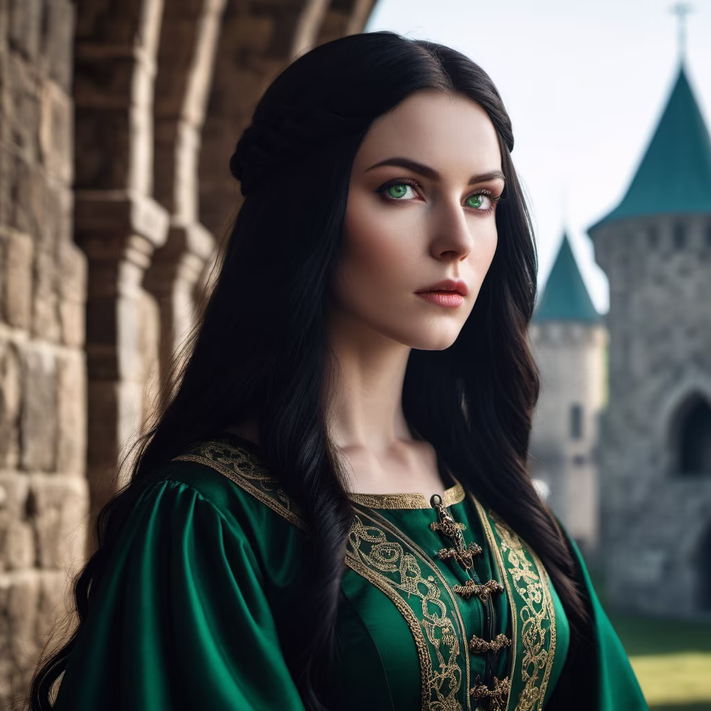 Prompt: Hyper-realistic and cinematic conceptual portrait of a mysterious and beautiful medieval woman. A beautiful woman with pale skin, long black hair abundant beyond the waist and piercing green eyes. She wears a dark medieval dress with wide sleeves and green embroidery. Her face has captivating features with a deep gaze. A black medieval castle is faintly visible in the background. The lighting is dramatic, with contrasts and stylized lights that give it an air of mystery. The image conveys epic medieval fantasy in every texture and hyperrealism in the details, high quality textures.