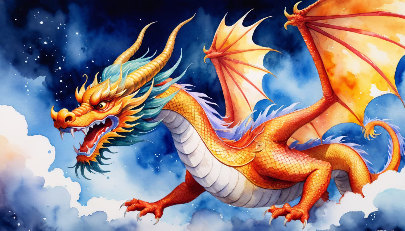 Prompt: Chinese dragon watercolor ink painting in the sky. watercolour illustration style.