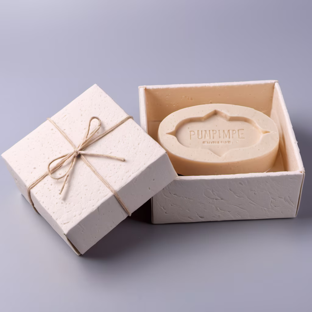 Prompt: Paper pulp box handmade soap packaging, with independent packaging, containing handmade soap, white pulp color, design, pulp texture box, can be used as a soap box, unique and creative shape,
