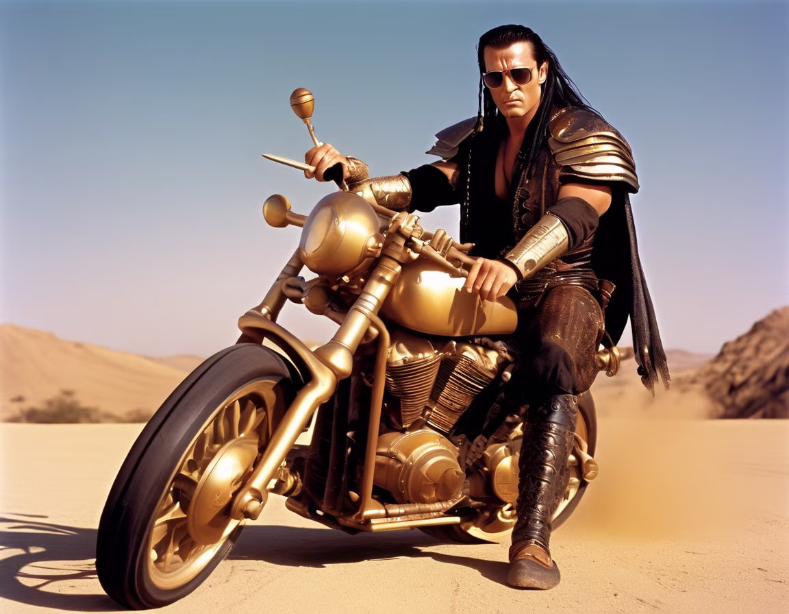 Prompt: very young dolph lundgren as scorpion king, sunglasses, big black hair, ride a tesla futuristic moto, cyber punk, in action movie poster , fine art