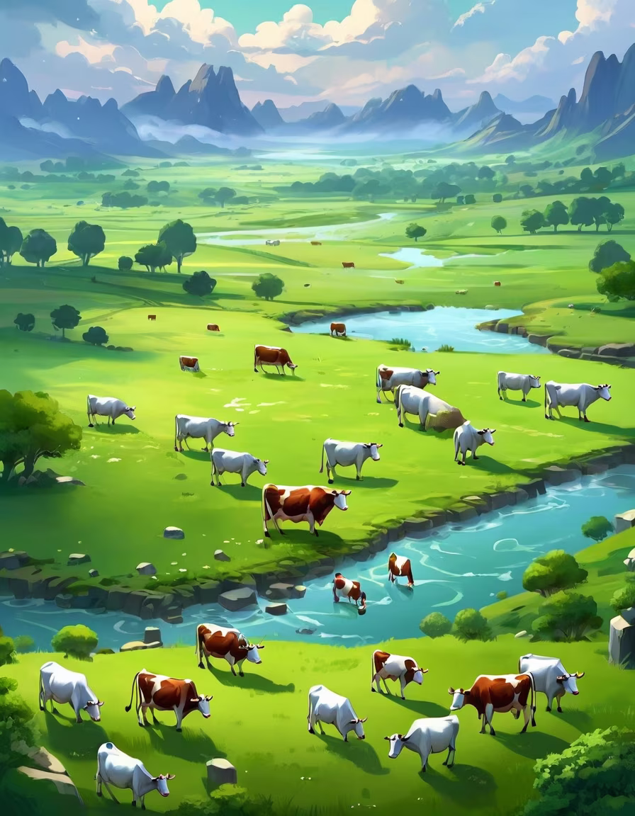 Prompt: Landscape illustration, high quality, 16k, mountains, grassland, American rural farm, cows, water, sunlight, day morning, bright, beautiful and harmonious, rich and broad picture, ratio 16:8