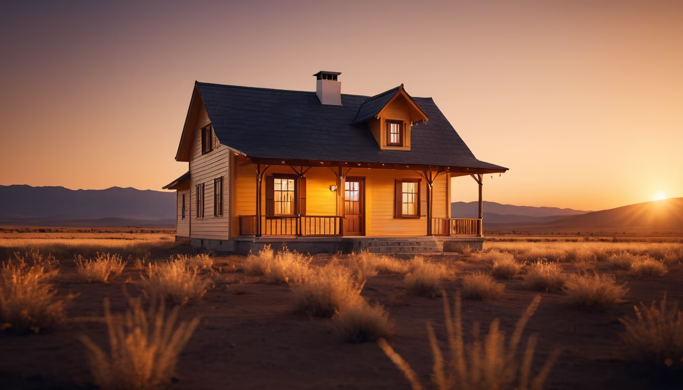 Prompt: an alone single story house in the middle of nowhere, golden sunset