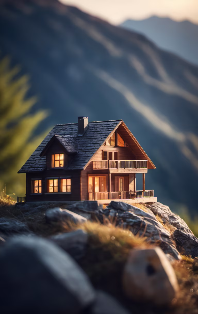 Prompt: create high realistic picture with a beautiful house in the front and some moutains in the background