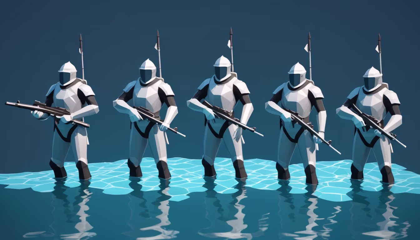 Prompt: A group of medieval soldiers, fully clad in wetsuits, engaged in scuba diving, holding rifles, swimming to the right, not standing upright, engaged in a swimming motion