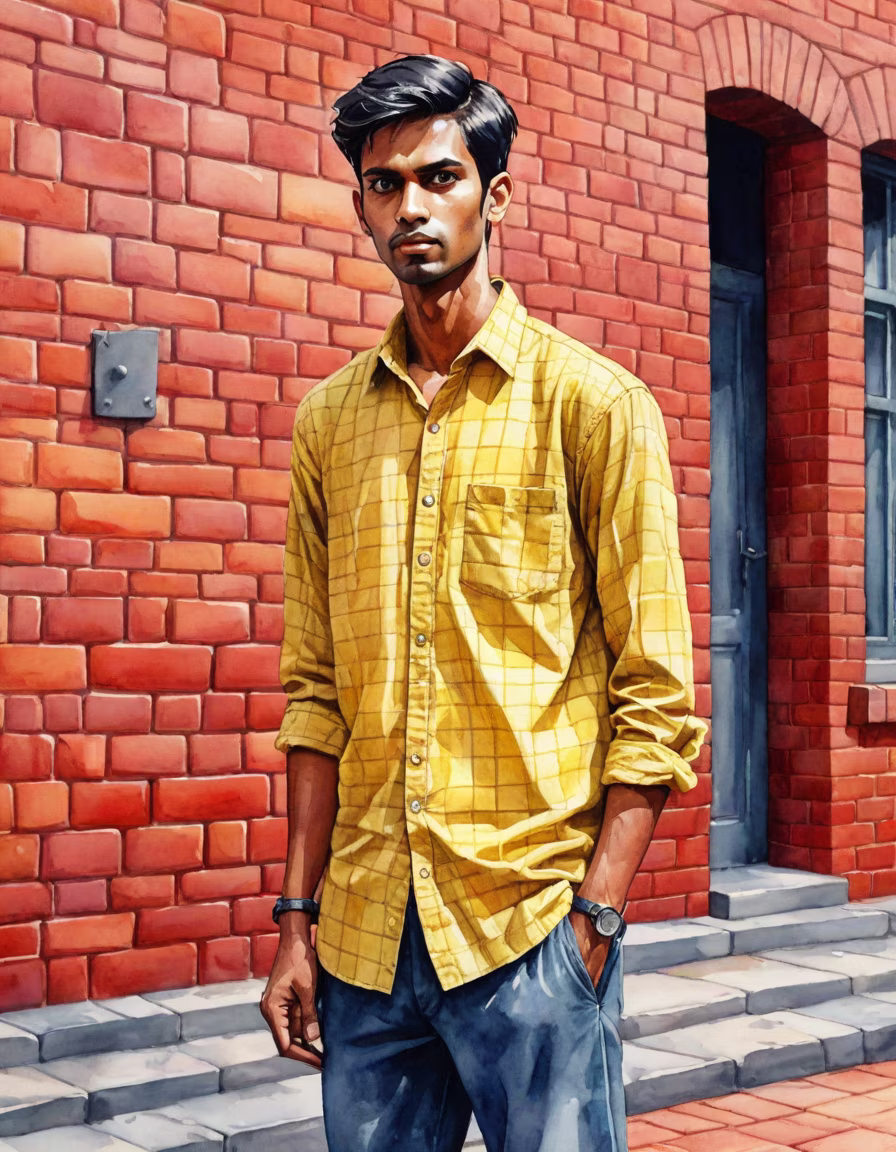 Prompt: Sense of scale. Street scene, an individual wearing a checkered yellow shirt striking a pose. Indian red brick wall as background.