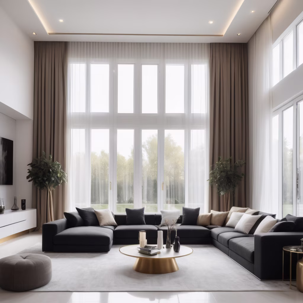 Prompt: A huge modern living room, soft lighting, exquisite craftsmanship, delicate texture, light white and white style, architectural renovation, modern minimalist style, long view of the window, light white and bronze color, flowing curtains, real shot scene, Equipped with black sofa, black chairs, double glass doors --ar 47:64