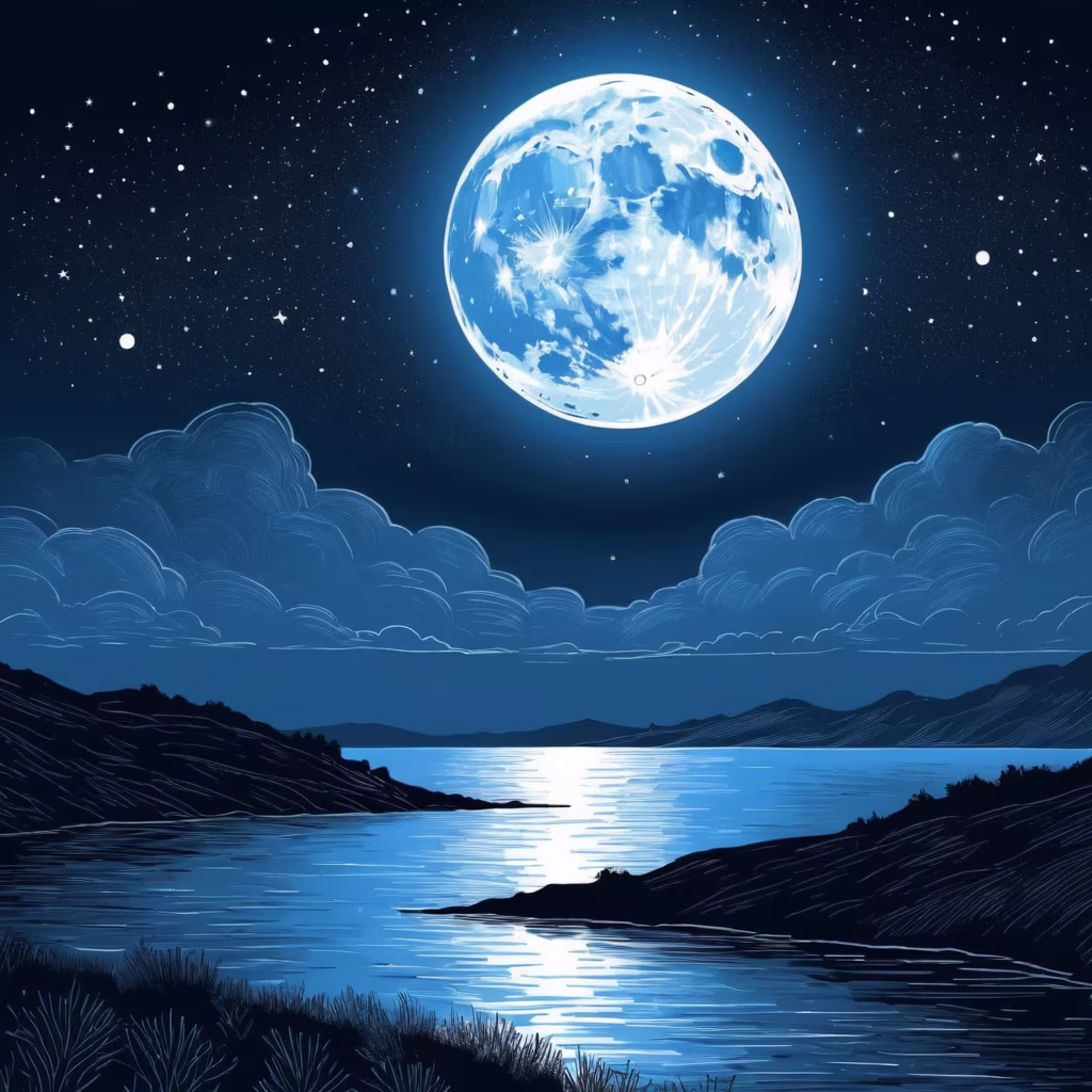 Prompt: Visualize a captivating sight—a beautiful blue moon gracing the night sky, its serene and enchanting glow casting a celestial radiance across the world, serene, enchanting, detailed, celestial beauty, ethereal, art by Vincent Van Gogh, Claude Monet.
