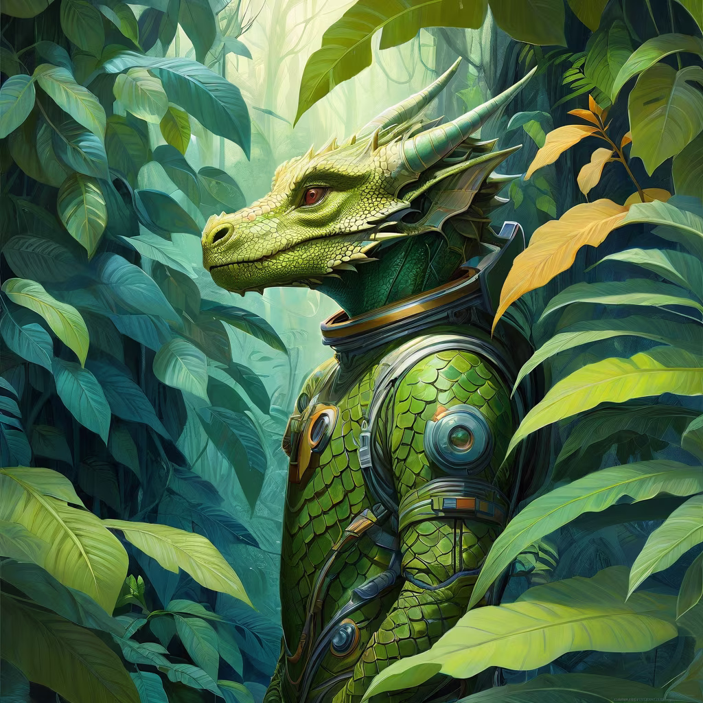 Prompt: A camouflaged dragon astronaut, minimal spacesuit, blending seamlessly into a lush rainforest, its scales resembling plant life, inspired by Rebecca Guay and fantasy art, intricate patterns, hidden details, vibrant greens, soft lighting, dreamlike atmosphere, digital painting, hyperrealistic, 16K, masterpiece.