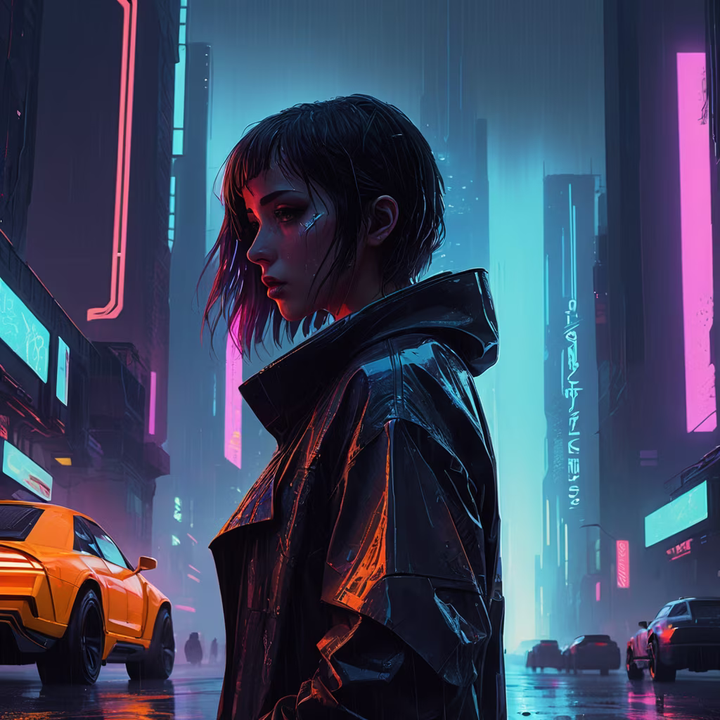 Prompt: Futuristic cityscape inspired by Blade Runner, rain, high detail, neon lights, rain-soaked streets, cinematic, urban decay, flying cars, towering skyscrapers, atmospheric perspective, moody lighting, digital painting by Syd Mead and Simon Stålenhag, 4k resolution. Negative prompt: car, Low-quality, pixelated, poorly rendered, dull colors, lack of detail, unrealistic lighting, amateur digital painting.