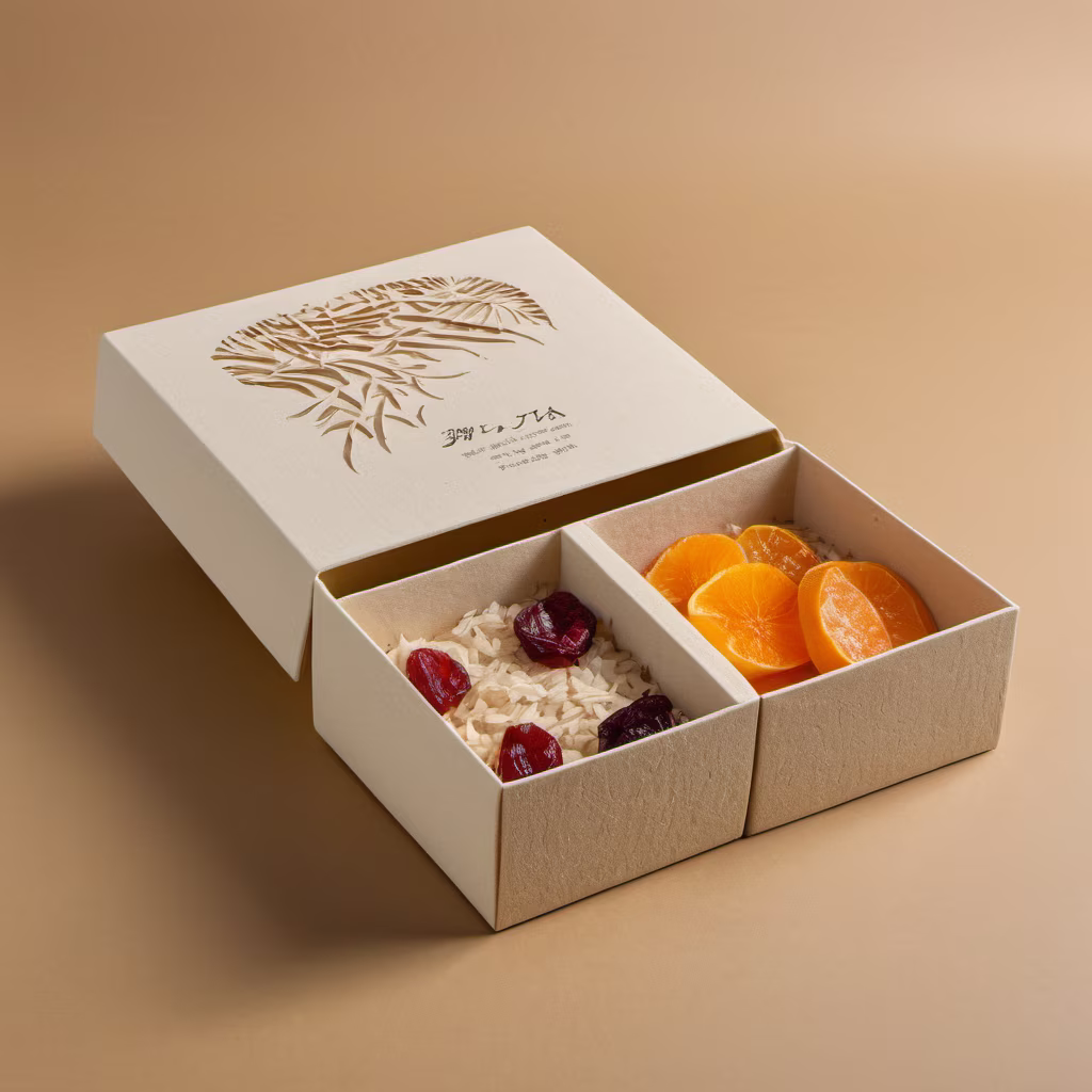 Prompt: Paper pulp environmentally friendly rice husk, dried fruit packaging box, high-end and simple, off-white and brown color, separated, with separate packaging inside, with design sense and calligraphy font