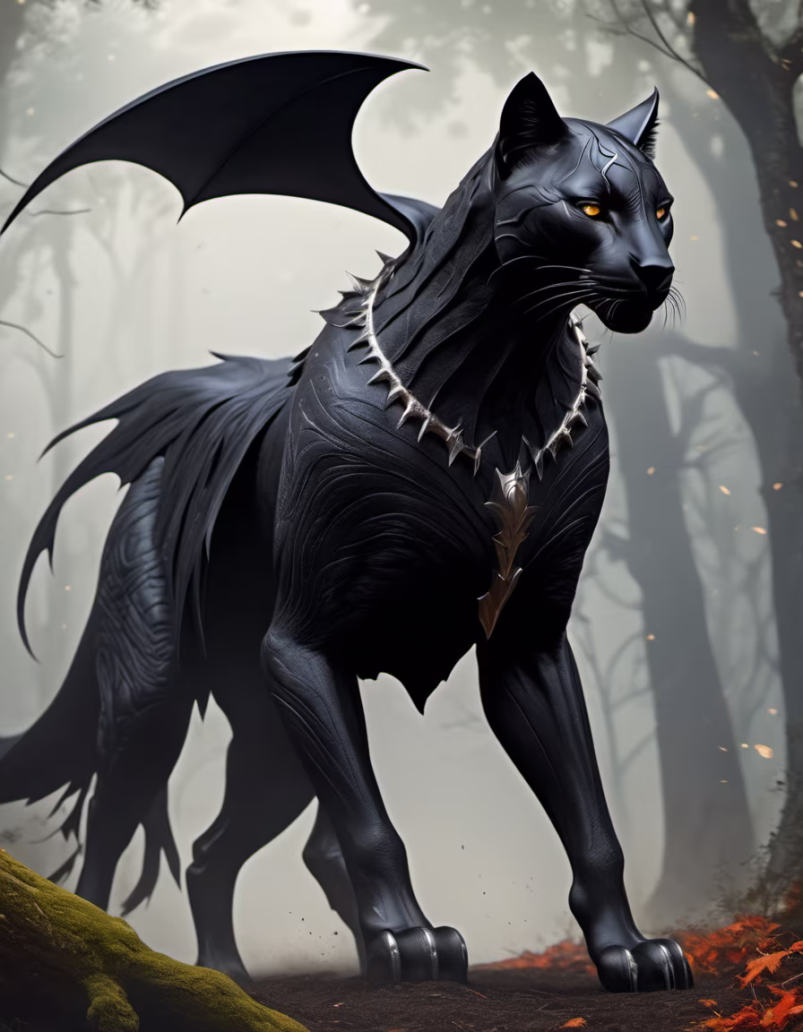 Prompt: A complex and fantastical creature with a head similar to that of a black panther, (humanoid body) draped in black cowhide fur, horse hooves, and bat-like wings. It stands in a magical forest, emanating an aura of death, with black mists swirling on the ground,art by Salvador Dali