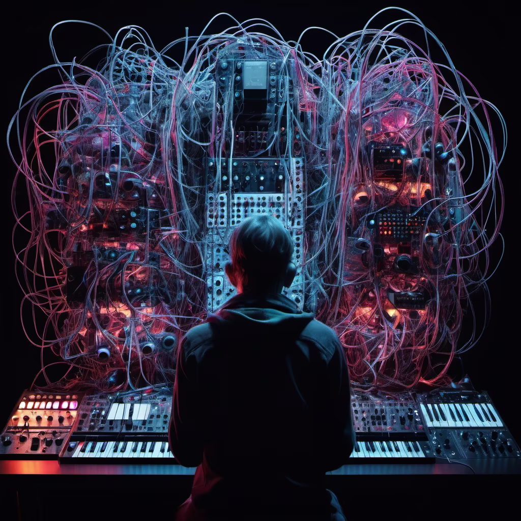 Prompt: modular synthesizer surrealism is above all a state of mind, modular synthesizer schizoid acid fueled chaos magic, double exposure inside of the weirdest modular synthesizer I have ever seen, glowing LED lights, patch cables, wires