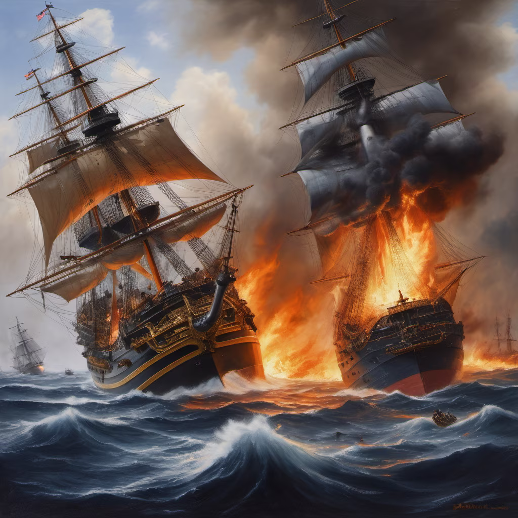 Prompt: Content: The Battle in the Caribbean Medium: Historical Oil Painting Style: Fusion of Classical Realism with war artist John Trumbull's aesthetics Lighting: Blood-red sunset highlighting the brutality of the naval battle Colors: Deep ocean blues and fiery reds of warfare Composition: Portraying the intense clash between Wayne's fleet and the British Navy, emphasizing the moment of Mary and Anne Bonny's arrest
