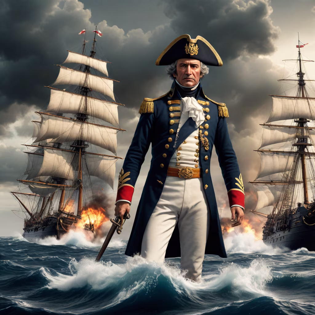 Prompt: Guillermo Brown, the fearless admiral, leading the charge during the Battle of Montevideo in 1814. Characters: Guillermo Brown, Naval forces Description: Bold and strategic Era: 1814 Attire: Naval uniform Location: Waters near Montevideo Action: Steering his ship into the heart of the battle Background: Cannon fire and billowing smoke Shot Type: Wide-angle capturing the intensity of the naval engagement Style: Hyper-realistic, photo realism, cinematography Format: 9:16