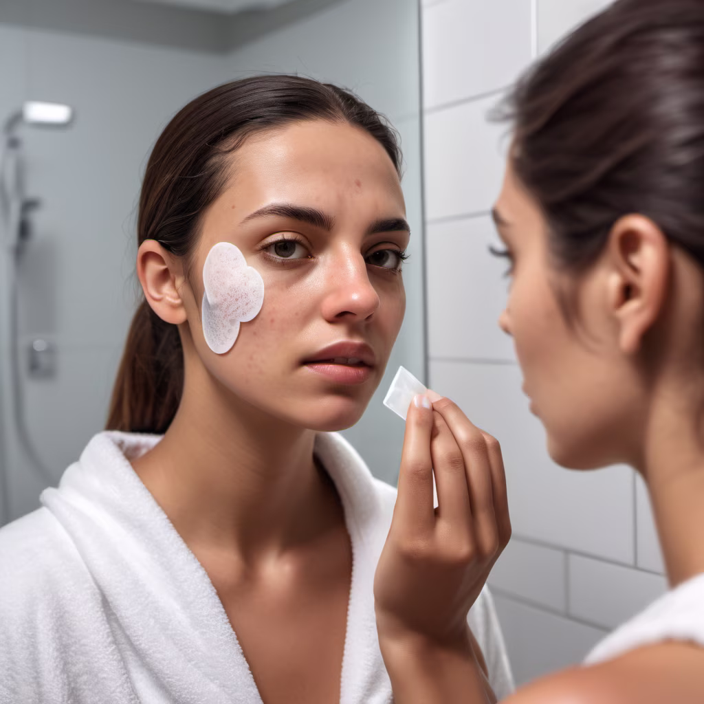 Prompt: realistic Brazilian woman in a modern bathroom setting, applying a barely visible transparent acne treatment patch. The landscape format focuses closely on her, emphasizing the discreet nature of the patch and the moment of personal care in her daily routine. picture