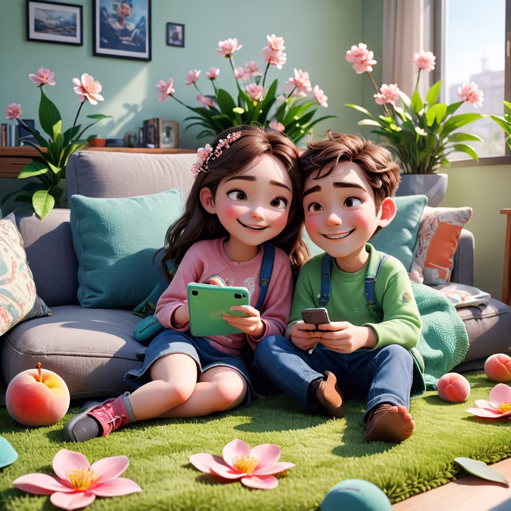 Prompt: A couple relies on each other and lies on the sofa, smiling. The girl is playing with her phone, while the boy is holding the girl. The carpet features a small and exquisite peach blossom landscape green plant, with morning sunlight shining in a modern style, red and blue color scheme, Pixar, 3D style, high detail, high quality, full of details, front view, 16k, ultra clear, full of sunlight, low light/morning light, OC rendering