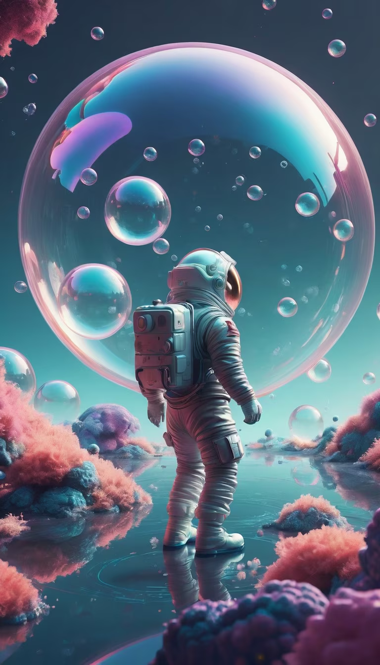 Prompt: An AI-generated digital artwork of an astronaut exploring a fantastical bubble wonderland, dreamlike, whimsical, aerial perspective, vibrant and pastel colors, influenced by GMUNK, beeple, Ash Thorp, Maciej Kuciara, surrealistic landscapes, cosmic lighting, intricate bubble formations, ethereal atmosphere, surreal creatures, infinite depth, fine details, 16K, imaginative masterpiece.