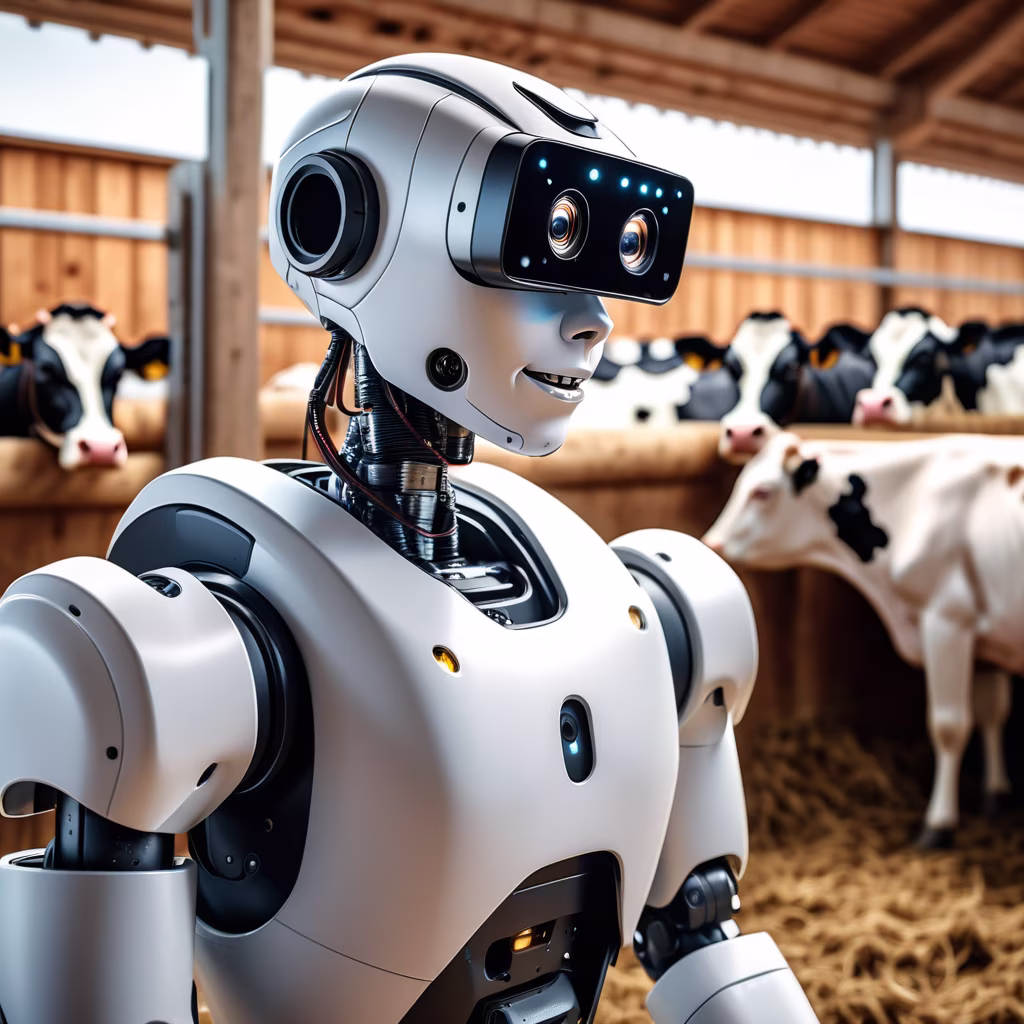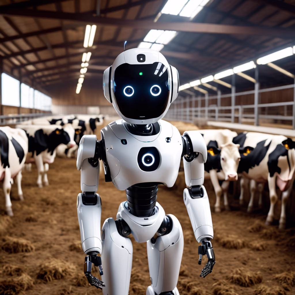 Prompt: robot with head-camera, stereo camera, white-colored full-body robot, robot on foreground, cows in stall and barn on background, natural lighting, hyper detailed texture, CGI studio quality style